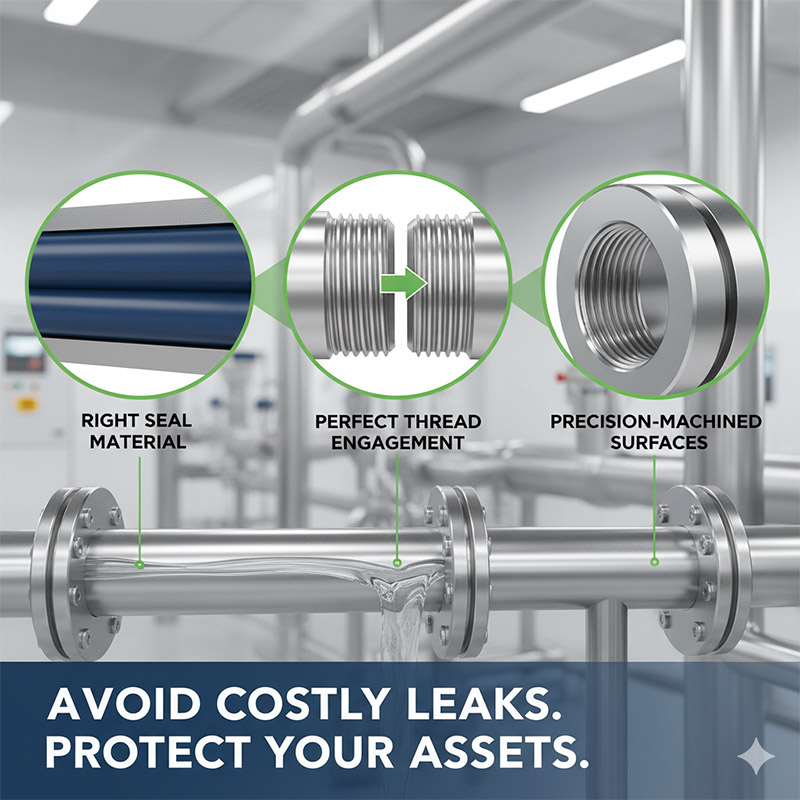 Leaks almost always start at a connection point. A tiny imperfection is all it takes. A common culprit is poorly cut threads. If the threads are rough or don't have perfect geometry, they create tiny gaps, even when fully tightened. Another major failure point is the sealing surface itself. In fittings that use an O-ring or gasket, the metal surface it presses against must be incredibly smooth. A microscopic scratch or a burr left from the machining process can slice or damage the seal, creating a persistent leak that's hard to find. We solve this by using CNC machines that produce surgically precise threads and mirror-smooth sealing faces. We then use high-quality seal materials like Viton®, which resist chemicals and compression far better than standard rubber. It’s a system designed to create a perfect seal every time.