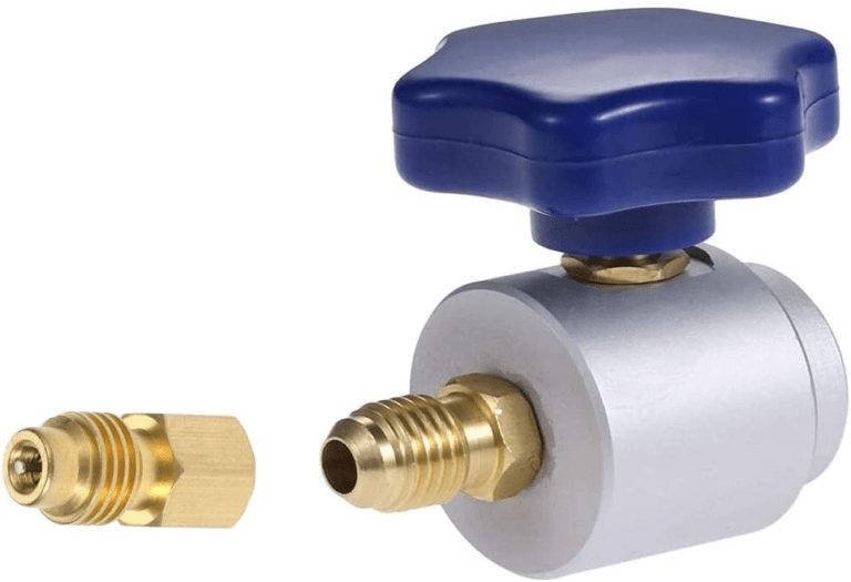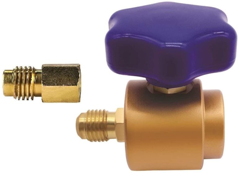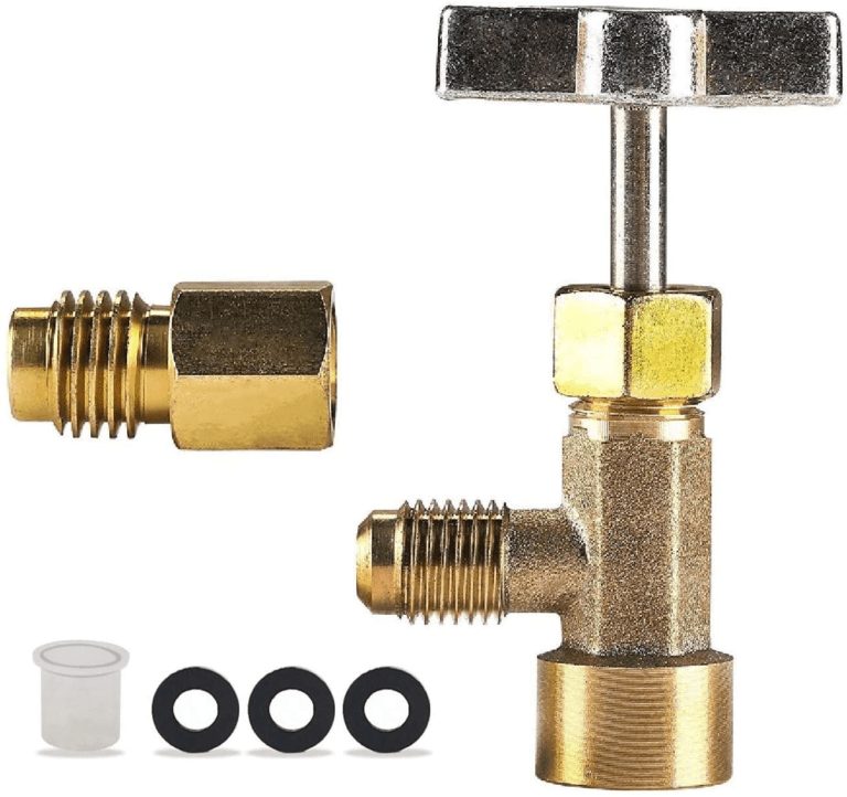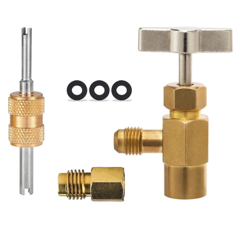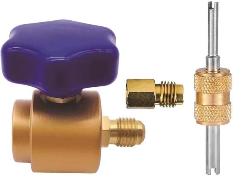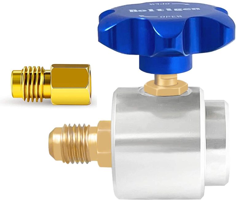 Aluminum Can Dispensing R-134a AC Refrigerant Tap Self- sealing 7/16-28 UNF Female Fine Thread Valve Tool Bottle Opener with 1/4″ SAE x 1/2″ ACME Tank Adapter for Air Conditioner Manifold